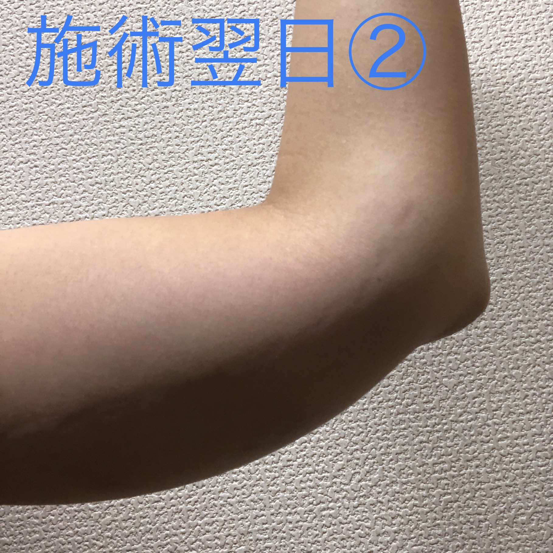 施術翌日:痛々しく、周辺が青々としている。この日が一番ひどい気がします。肘の関節より上がパンパンになっている感じ。触るのが怖い。